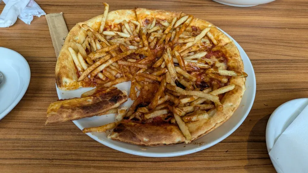 メニューを見て気になった「アメリカンピザ」を頼んでみたのですが、運ばれてきてびっくり。ピザの上にこれでもかというくらいポテトが乗っていました。